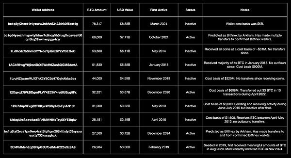以下是最大的未歸屬Bitcoin持有者表格,顯示其持有的Bitcoin數量、占流通供應量的百分比、錢包狀態(tài)以及對錢包的觀察。