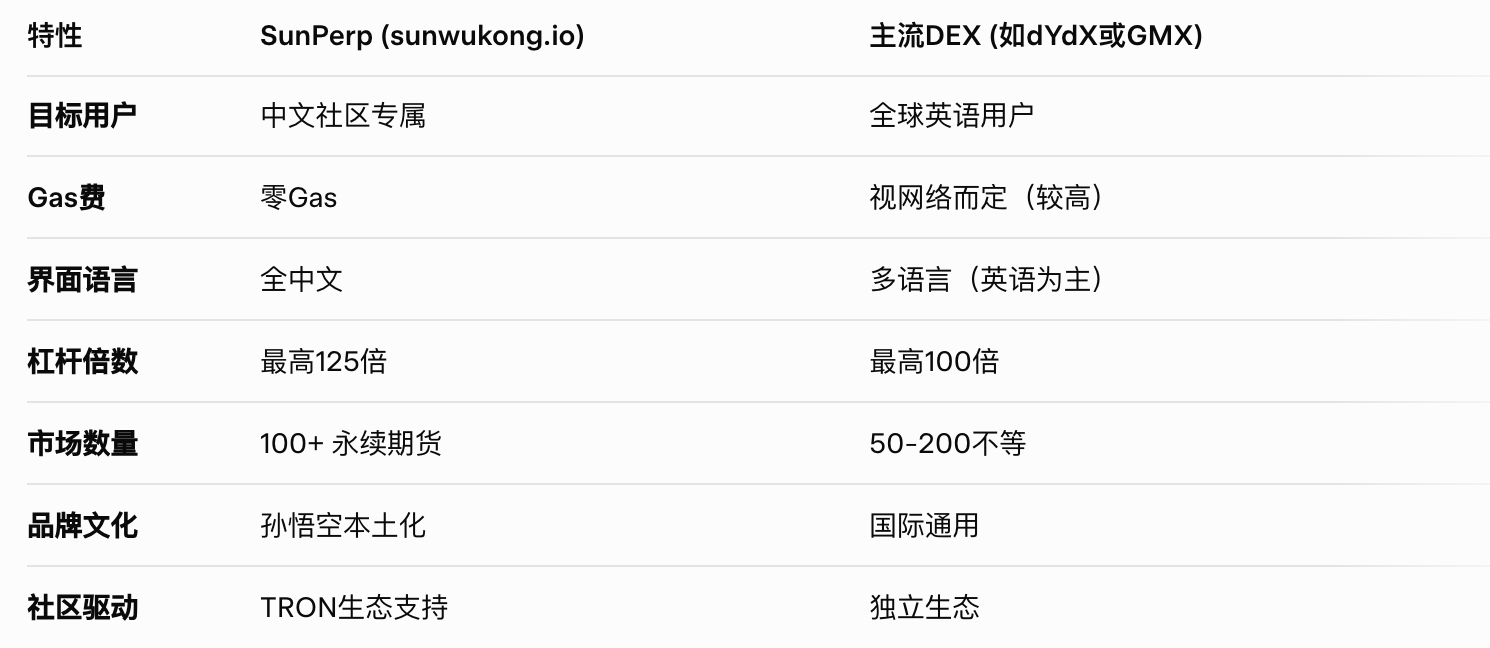 在競爭激烈的DeFi市場,SunPerp脫穎而出,得益于其獨特的定位和生態支持。以下表格對比了SunPerp與其他主流DEX的核心差異: